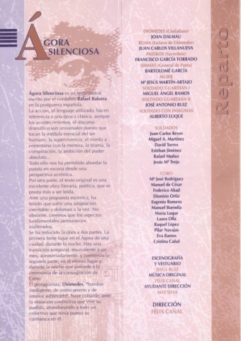 El 30 de marzo de 1995 tuvo lugar en el Gran Teatro de Córdoba el estreno de la obra de Rafael Balsera del Pino Ágora silenciosa. Dirigida por Félix Cañal, esta producción del Gran Teatro contó para su reparto, entre otros, con los actores Joan Dalmau, Juan Carlos Villanueva, Francisco García Torrado, Bartolomé García y María Jesús Martín-Artajo. La obra se representó también el día 31. Como testimonio de aquella puesta en escena se incluyen algunas fotos de la misma tomadas por Manuel Ángel Jiménez.